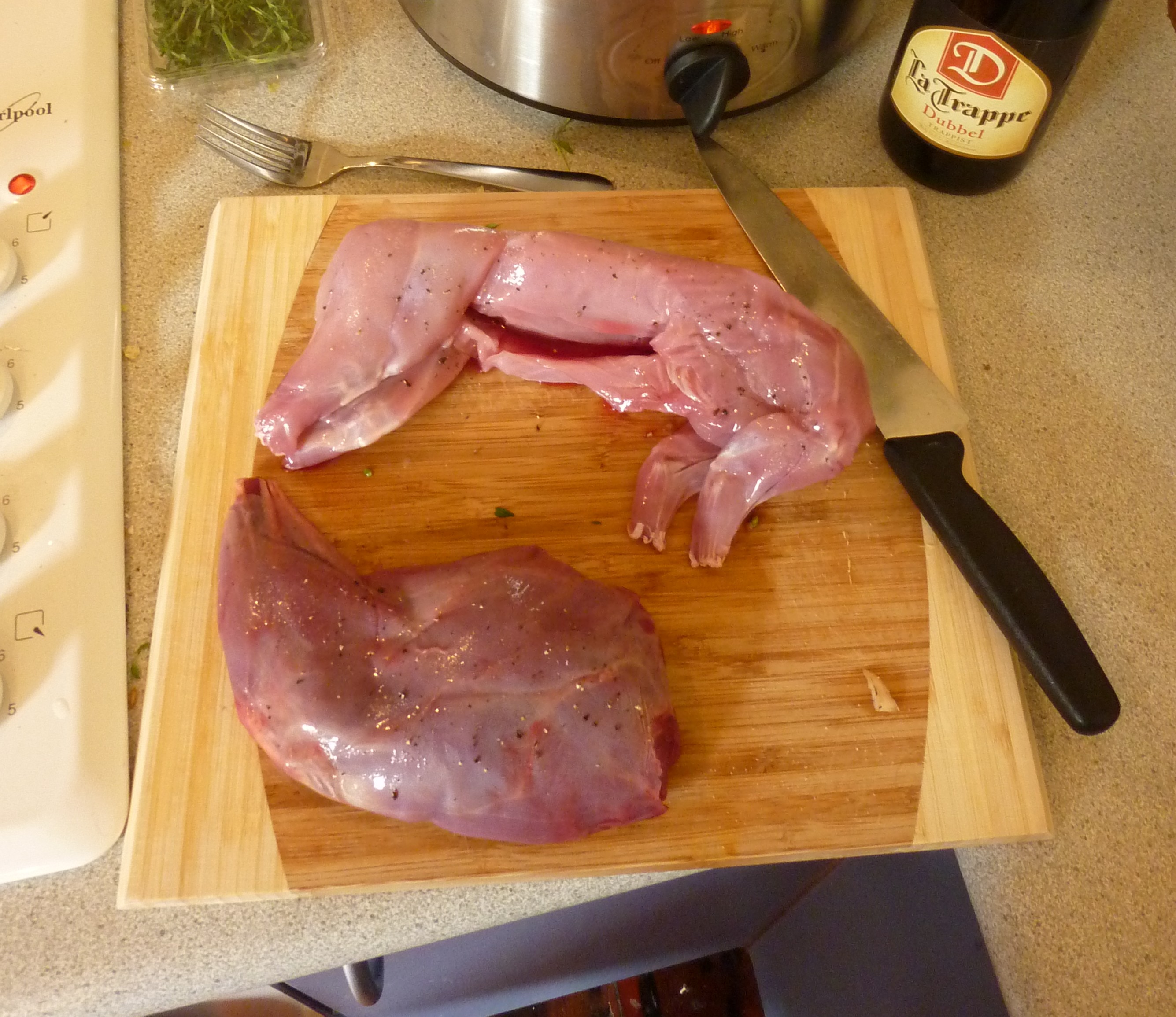 The first rabbit I cooked I shared with Dave from Hashigo.  We named it Sir Charles Johnson and slow-cooked it in home made cider.   It was pretty good, but I felt a more solid booze-base would be even better.  So when another friend of mine, Hannah, heard about and demanded her own rabbit-feast, I decided that this time around it was ‘go big or go home!’  And big I went, with La Trappe Dubbel.1