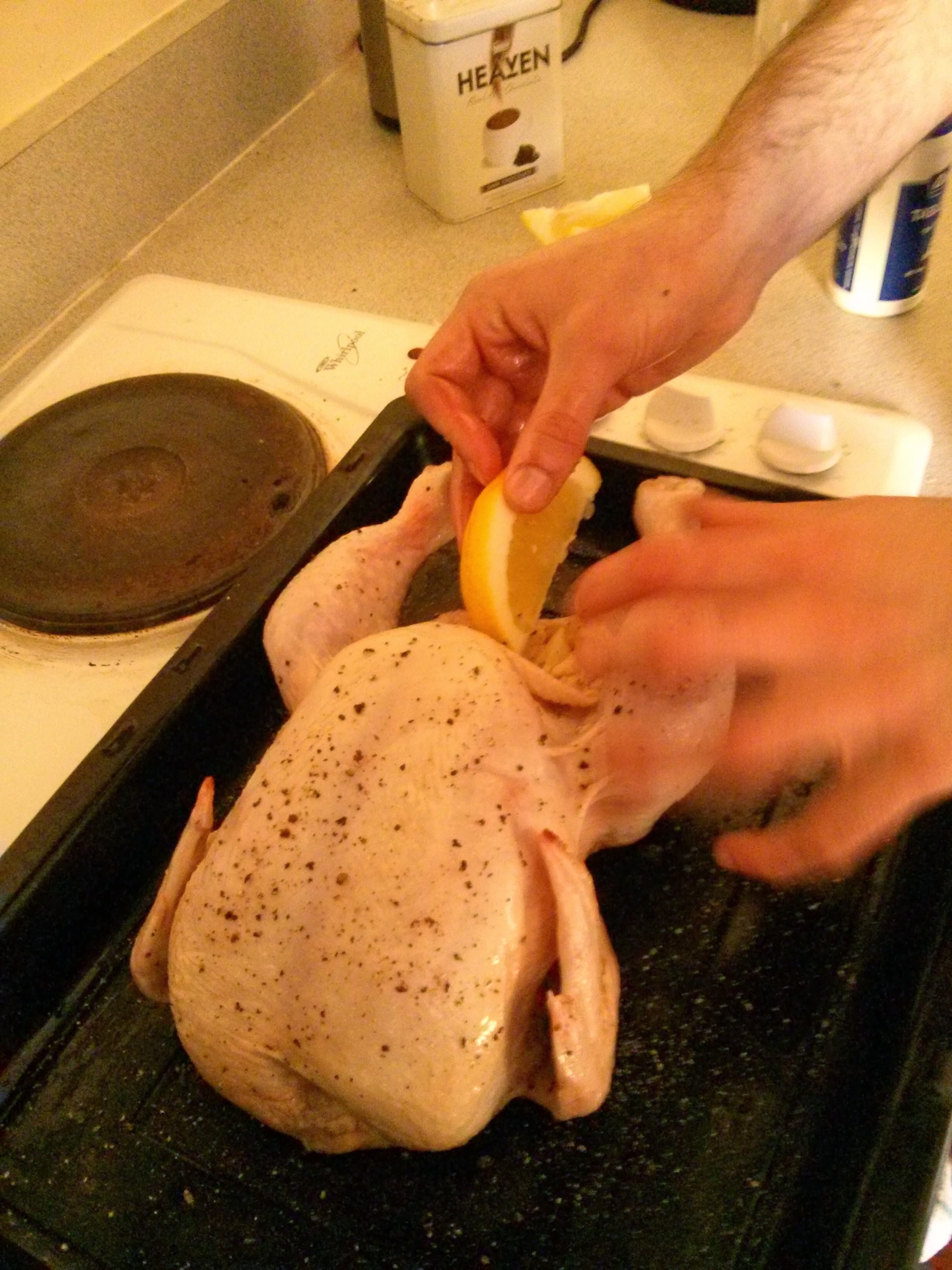 Season your chicken with oil, salt and pepper. Stuff some lemon in.
