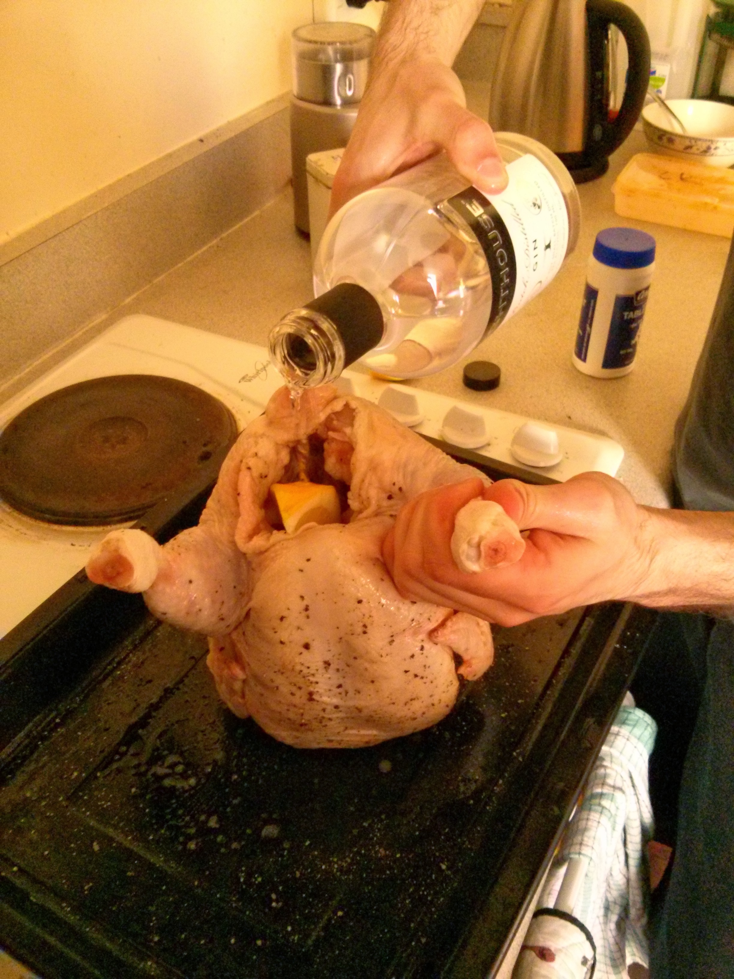 You know how sometime, great ideas come from combining two things together? Well that’s what happened in my brain: two thoughts collided and a new idea was created: “I should shove a G&T up a chicken’s bum.”