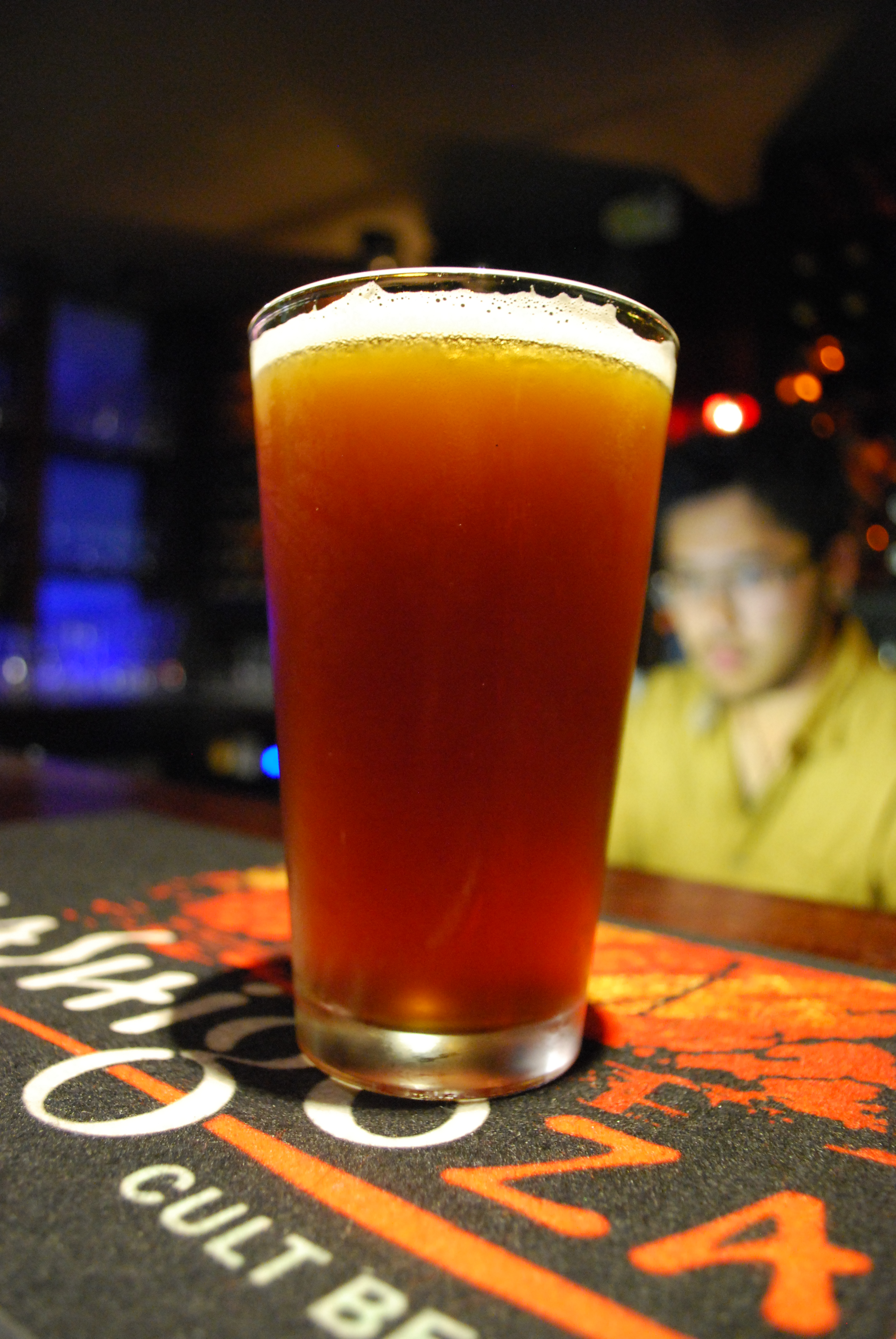 It’s cloudy, pale orange. Smells leafy-green and kind of lemony. The flavour is very bitter, but the body is full which counter-points it nicely. The over-all hop character is peppery, with hints of lemon.