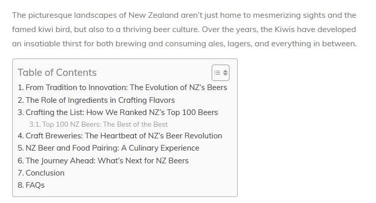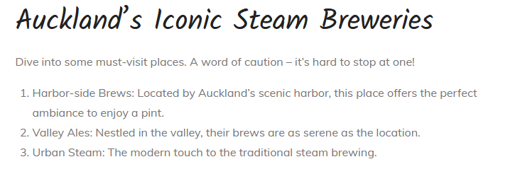Take “10 Must-Try Craft Beers in New Zealand”. It starts off with a weird table of breweries and mini bios called “Main Features”, which doesn’t feel right to me. Again, it feels more like part of an abstract or summary from a technical article. After that it goes to detailed bios, which again feel like more empty platitudes, stretched versions of the “Main Features”, with details pulled and re-worded from marketing material.