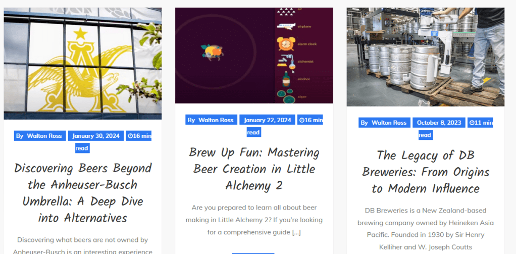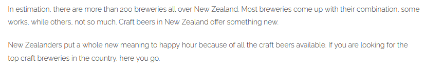 While a whole new website opens new possibilities – there are six new articles to read. But what I quickly learn is, while they are completely different, they are more of the same slop as we’ve already seen. Take the article “The Best Craft Breweries here in New Zealand”. Here’s the opening sentences: