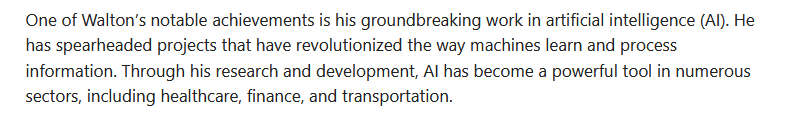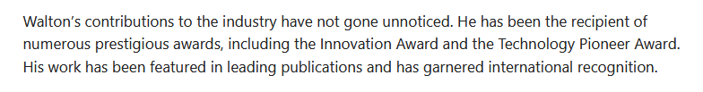 At first that feels like information, until you realise it’s so vague that it’s completely unverifiable. I tried searching for things called the Innovation Award and the Technology Pioneer Award. I found multiple different awards with those names, none of which seem to have been won by a Ross Walton.