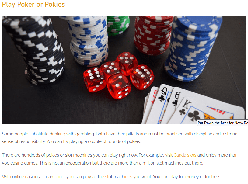 There it is: online gambling. And this time it’s not a subtle link, slipped in. This time it’s “Beer is like gambling. People like gambling. Gamble here.” What the fuck? Combing through the other articles, I found multiple references to online gambling. The most egregious being from “Put Down the Beer for Now. Do This Instead”. You know what advice it gives for a safe and healthy alternative to drinking? That’s right, gambling!