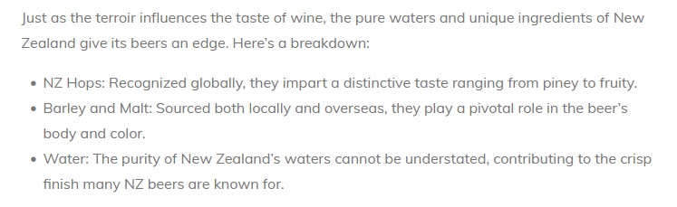 With all this in mind, I started reading more and more articles. Pieces with titles like “10 Must-Try Craft Beers in New Zealand”, “Exploring the Strongest Beers in New Zealand” and “What Is The Most Popular Beer In New Zealand”. These are all titles you might plausibly find on a lifestyle or travel blog. But if you actually read them, everything about them is wrong. Not factually wrong. The details are usually broadly accurate, but just somehow the articles are always just off.